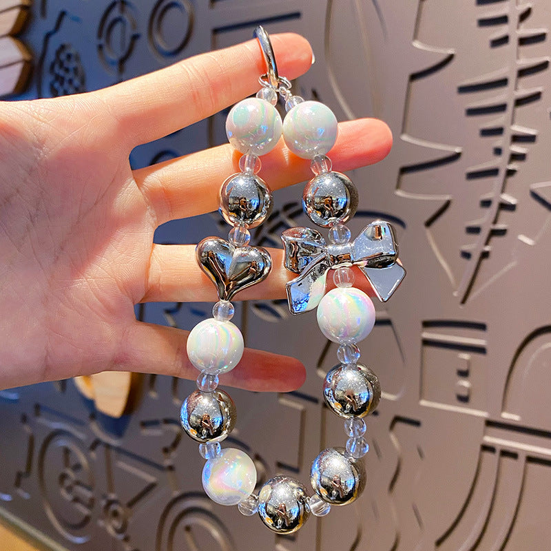 Metallic Bow & Heart Charm Strap – Silver Glossy Beads with Cute Accents | FAMAKA